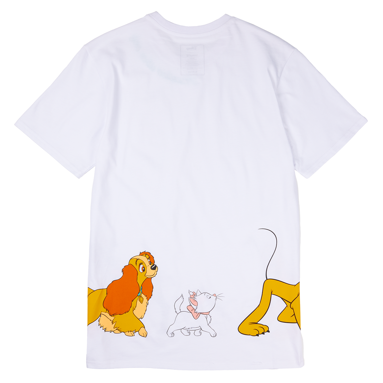 This unisex tee features some of your favorite Disney dogs and cats walking together across the front and back.