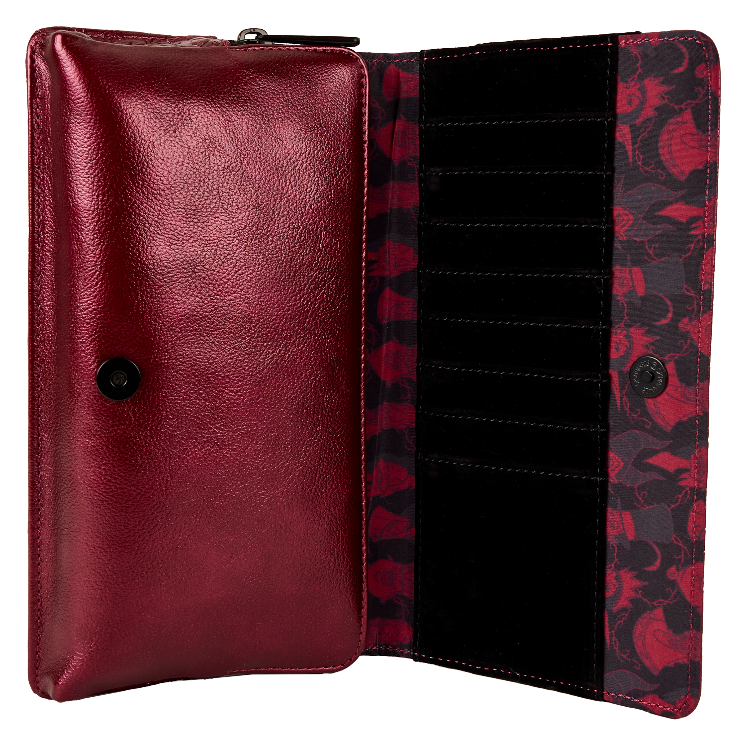 Find debossed symbols of popular Disney Villains within spiky thorns all over the bag. Stud cones and velvet bring the whole look together. This style is versatile: you can carry it as a clutch by using the wristlet strap or attach the crossbody strap to wear it like a purse!
