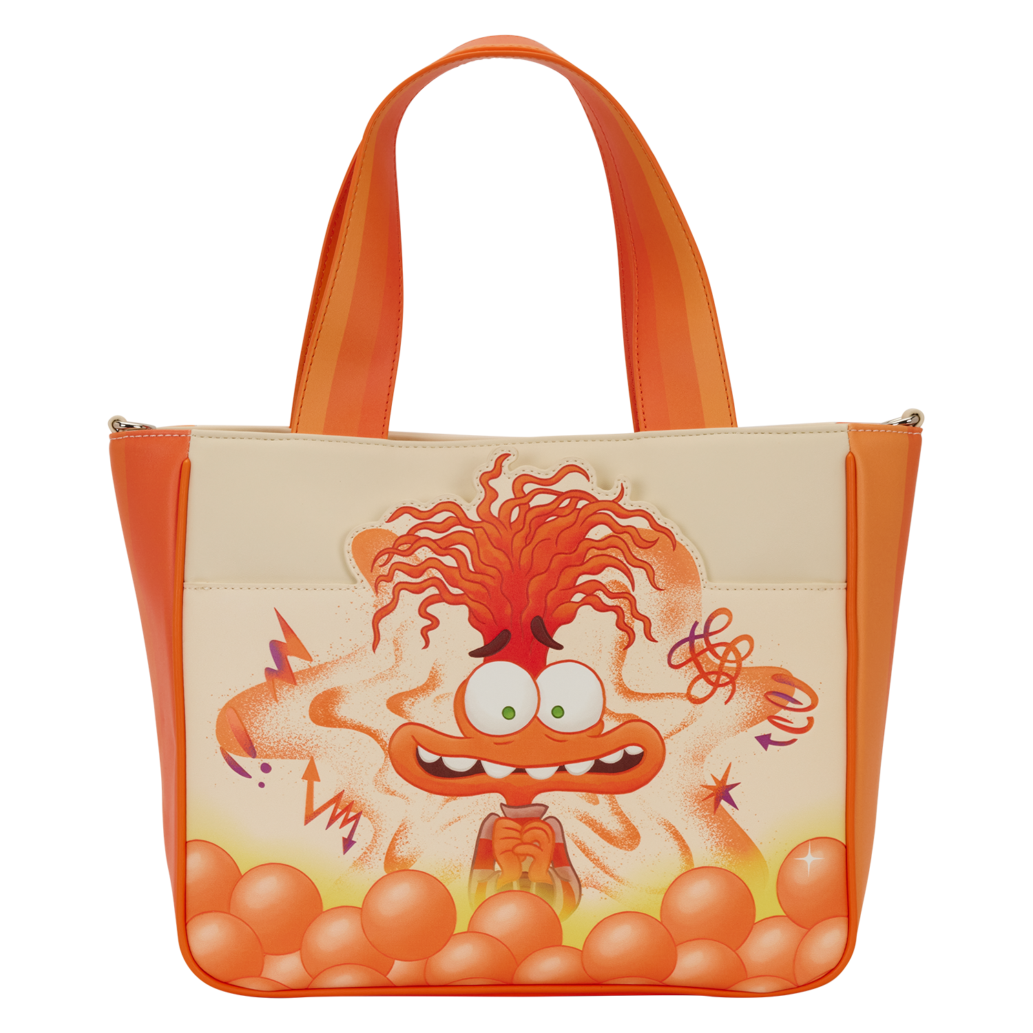 This tote bag is inspired by Anxiety from Disney and Pixar’s Inside Out 2. You’ll find her front and center on the bag, surrounded by orange memory spheres. Turn it around to find more orange memory spheres and Riley’s anxious Sense of Self. Plus, there’s a coin bag attached to the strap that features Riley’s anxious Sense of Self on one side and Anxiety on the other.