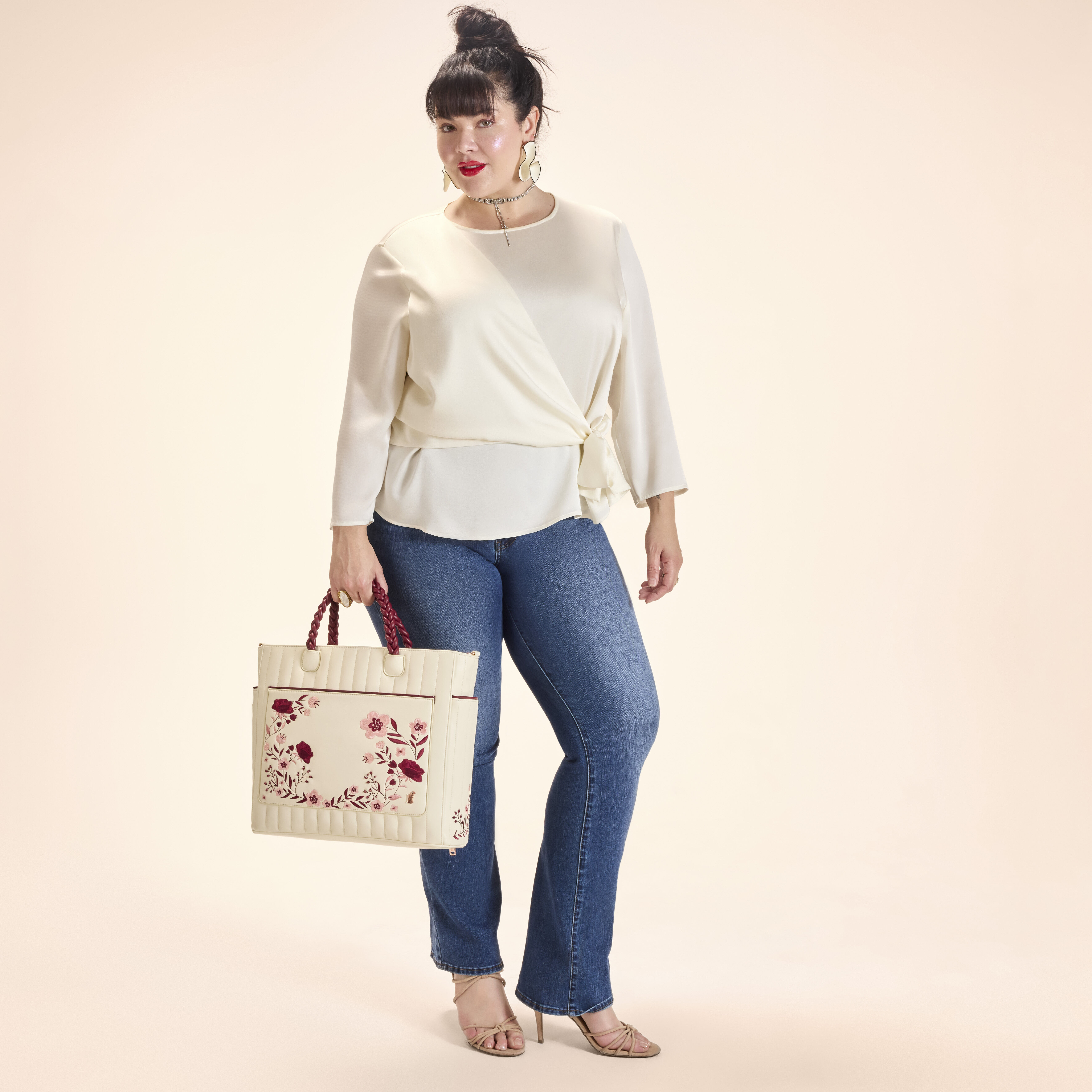 This tote features gorgeous red and pink florals on the front and side. Metallic beads and puff applique roses elevate the look. For extra versatility, this tote bag can convert into a backpack so you can wear it however you’d like! A braided top handle brings the whole look together.