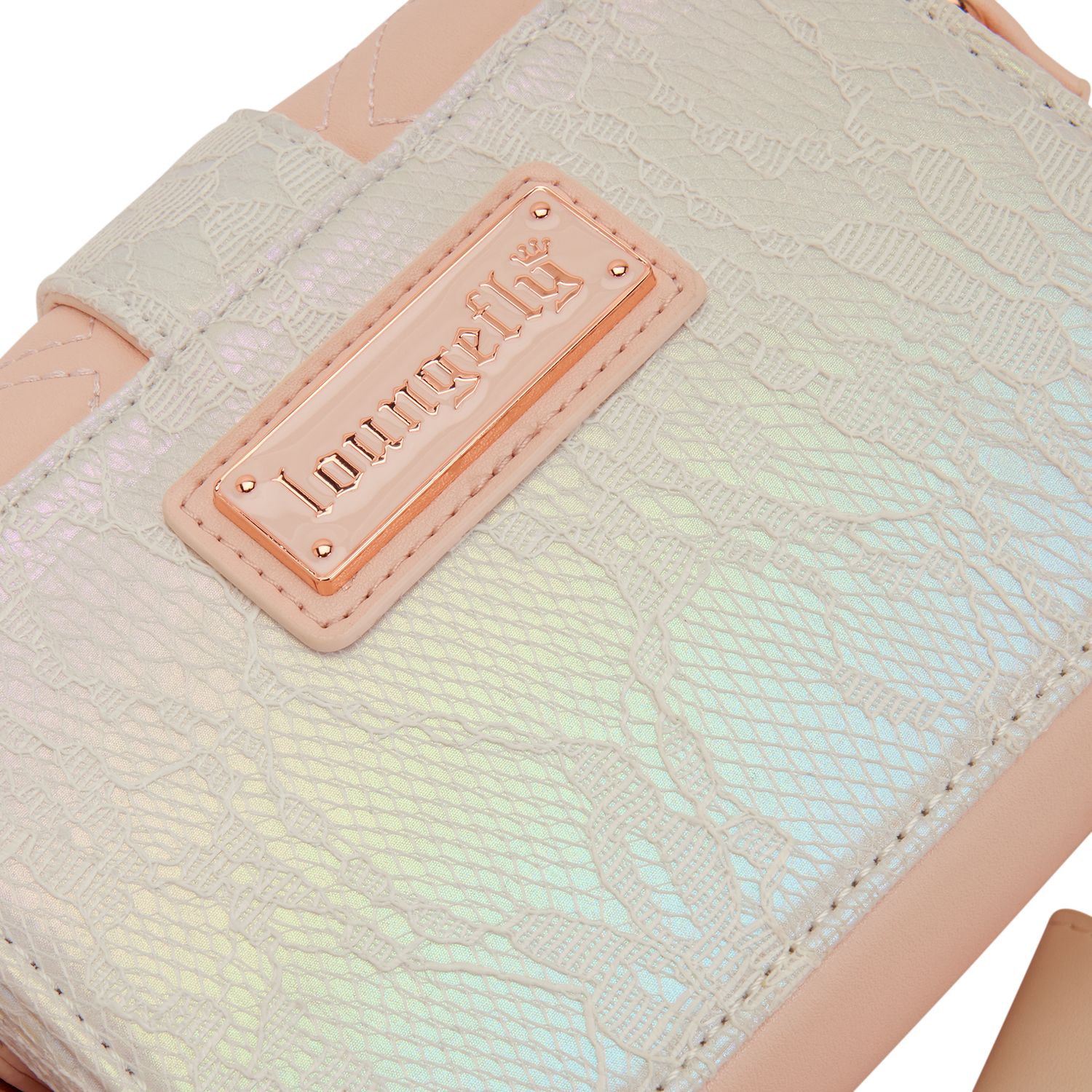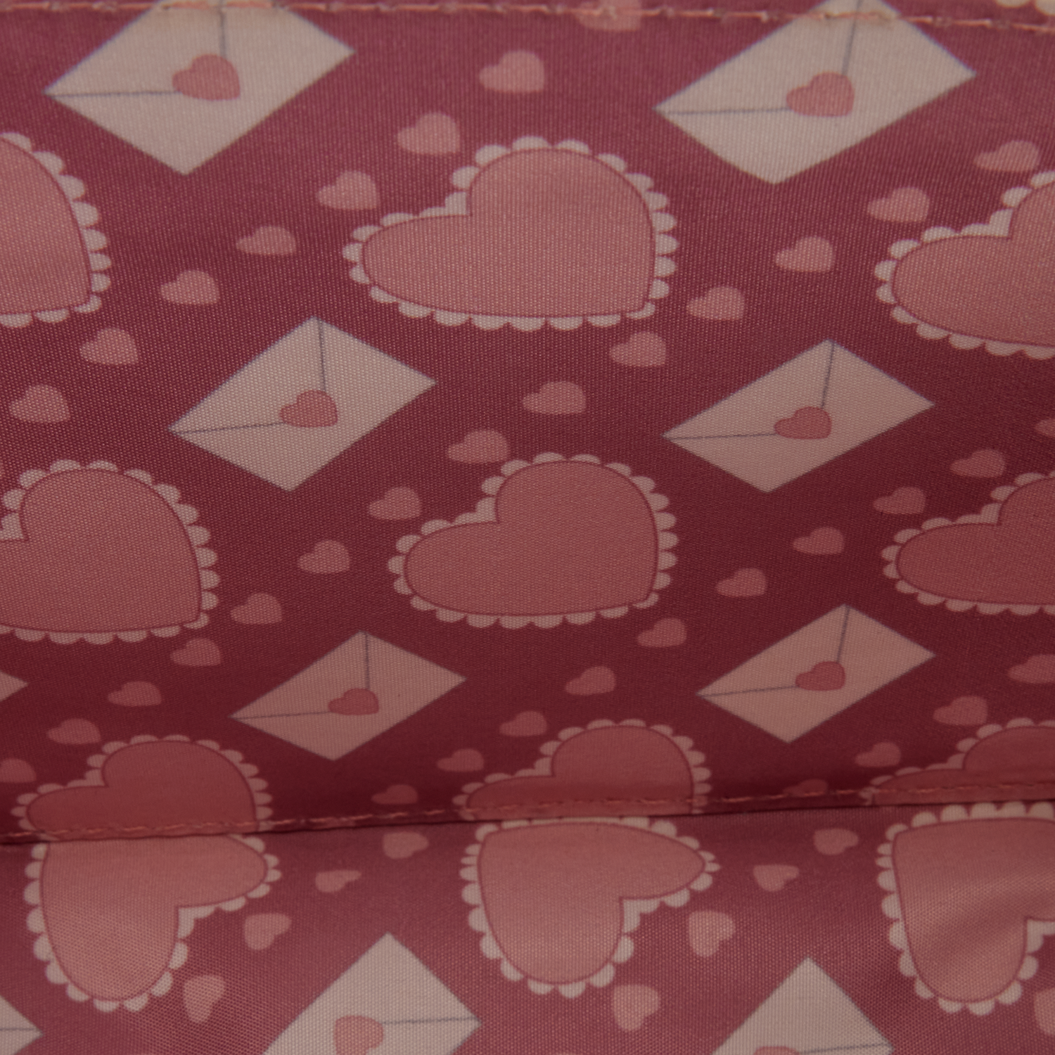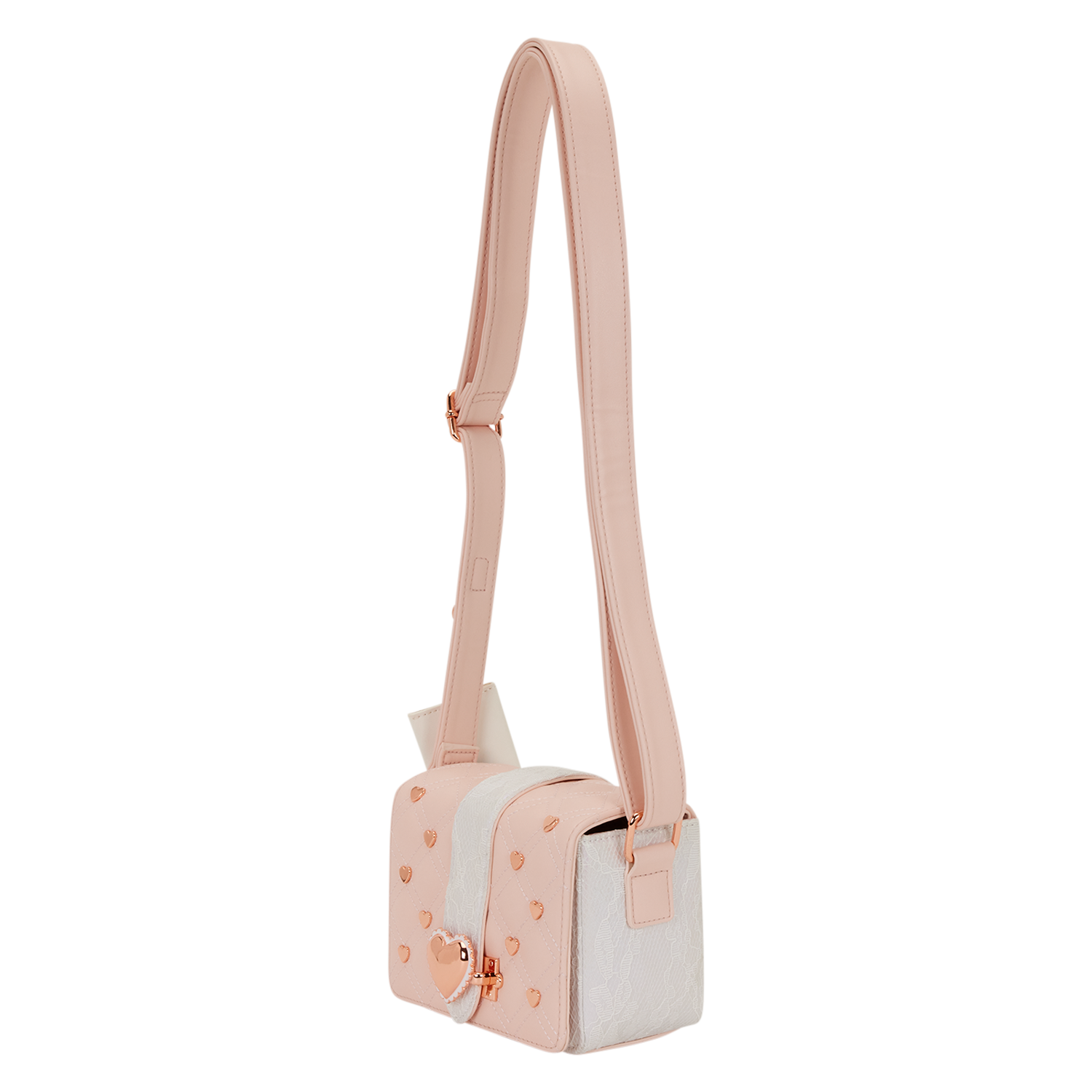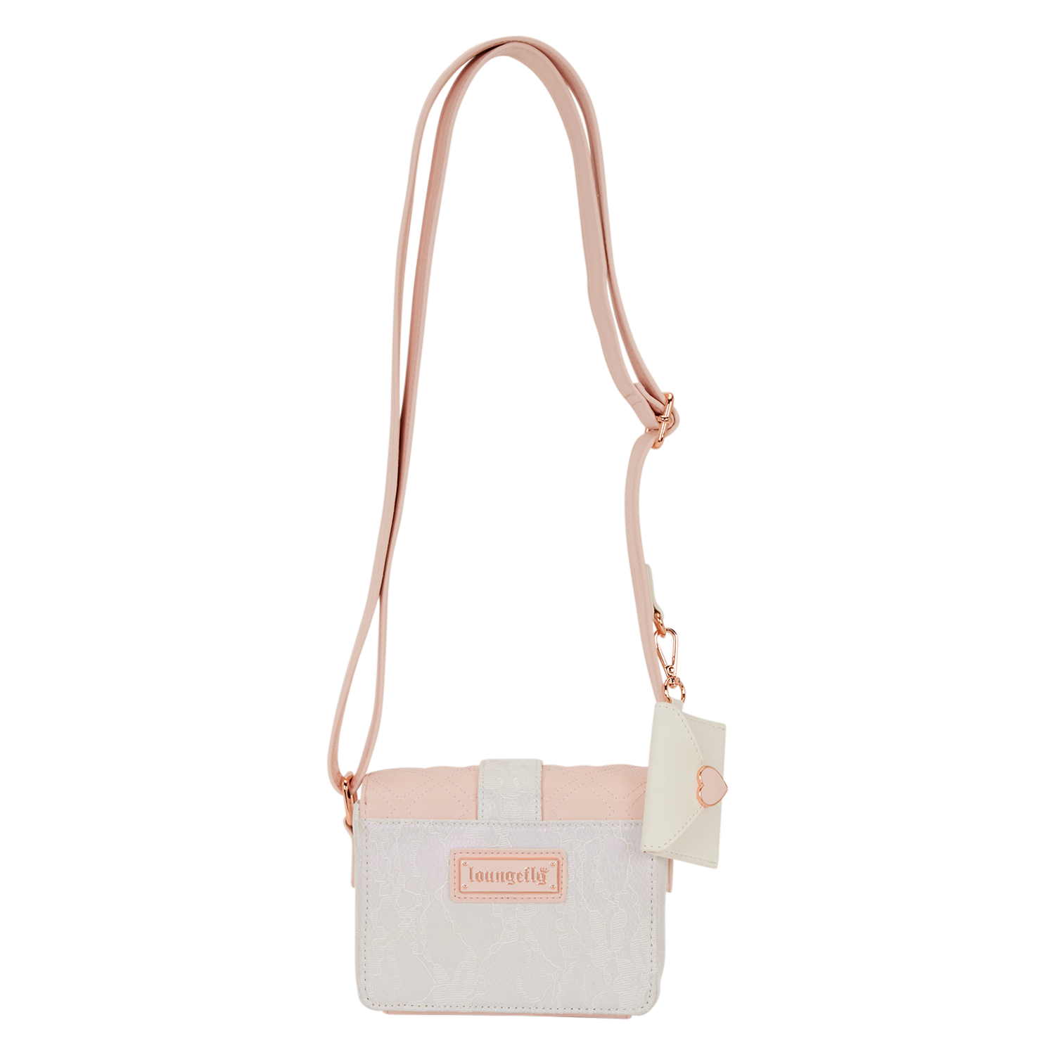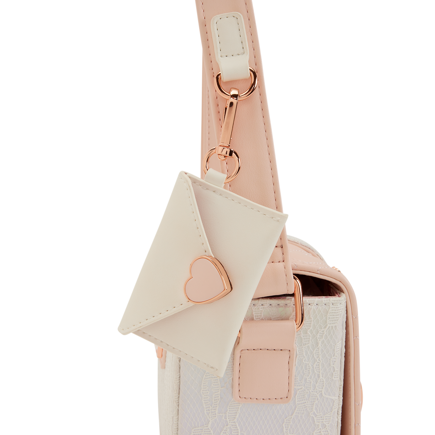 This crossbody bag looks like a pink envelope with lace trim and molded metal heart charms. The back of the bag features iridescent lace for an elegant feel. Attached to the strap is a detachable charm of a valentine with a silicone heart stamp!