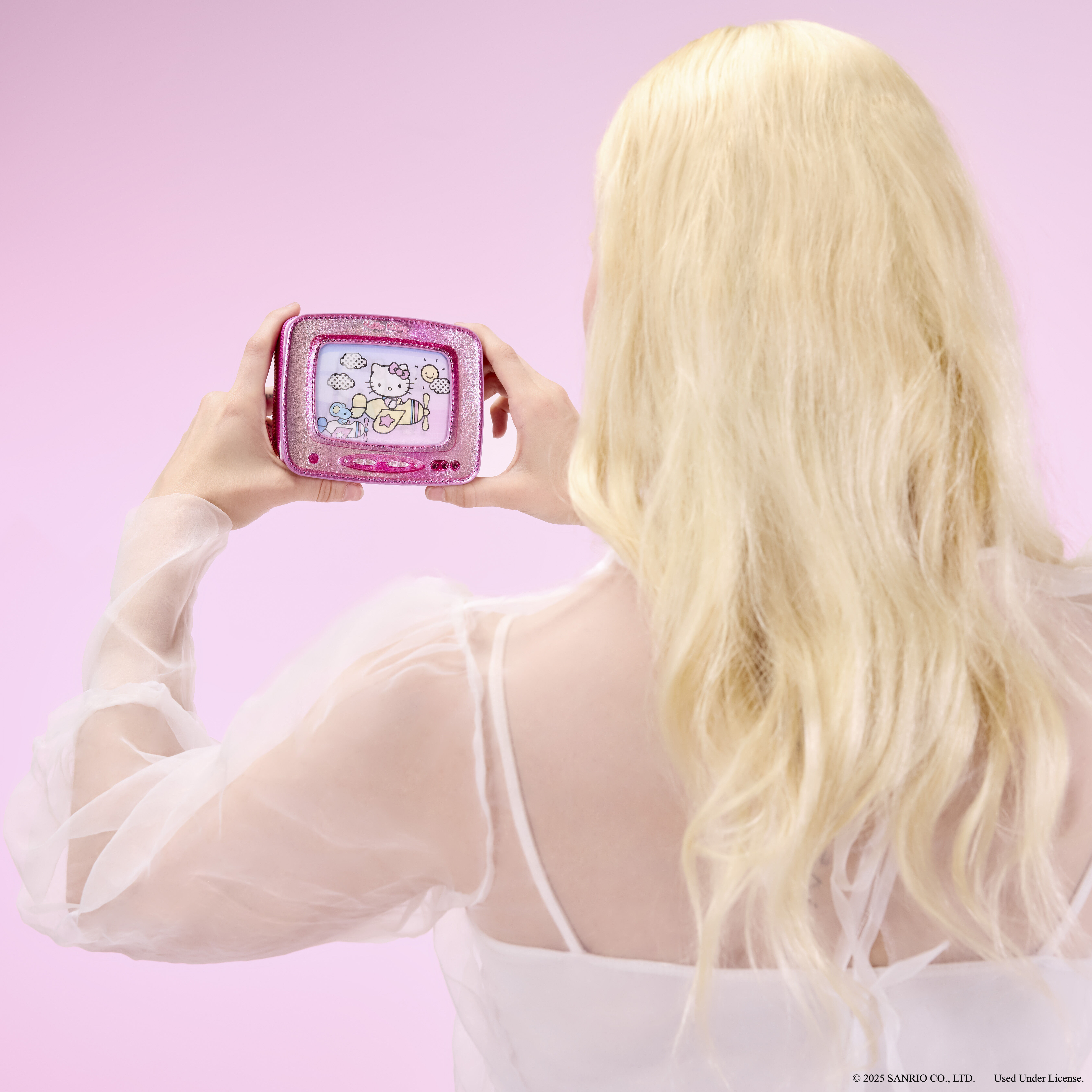 This wallet looks like a retro TV with metallic faux leather, embroidered, and debossed details. The “screen” is lenticular and features Hello Kitty in an airplane from one view and Hello Kitty and her friends getting the mail in another view! Inside, there are four card slots and one clear slot for an ID! It also has a super cute interior lining.