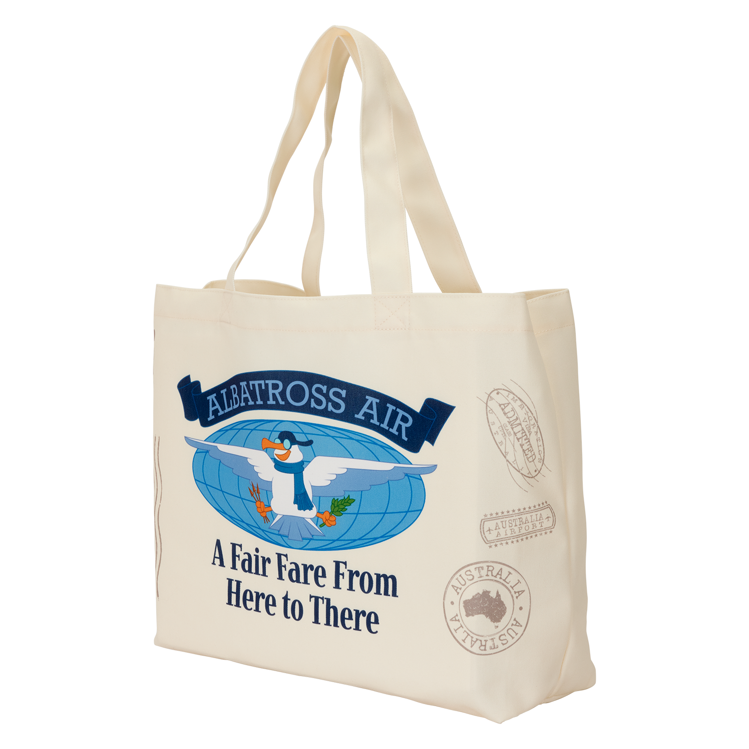 This canvas tote bag pays homage to Disney’s Rescuers Down Under and features the Albatross Air logo. You’ll find an Albatross symbol in front of a globe. Above is a banner that reads, “Albatross Air” and below it says, “A Fair Fare from Here to There.” Along the side you’ll see “Express” and other symbols “stamped” on the bag. Turn it around to find another Australia “stamp.”
